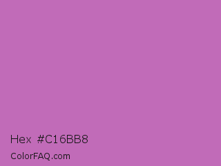 Hex #c16bb8 Color is a normal magenta color and the nearest color is Sky Magenta #cf71af. Hex code #c16bb8 and RGB value is rgb(193,107,184). In RGB color space, this color is composed of 76% red, 42% green, 72% blue, In CMYK color space, this color is composed of 0% cyan, 45% magenta, 5% yellow , 24% black , In HSL color space, this color has a hue angle of 306° , 41% saturation and 59% lightness.