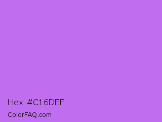 Hex #c16def Color is a light purple color and the nearest color is Lavender #b57edc. Hex code #c16def and RGB value is rgb(193,109,239). In RGB color space, this color is composed of 76% red, 43% green, 94% blue, In CMYK color space, this color is composed of 19% cyan, 54% magenta, 0% yellow , 6% black , In HSL color space, this color has a hue angle of 279° , 80% saturation and 68% lightness.