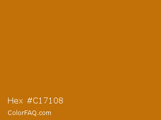 Hex #c17108 Color is a normal orange color and the nearest color is Indochine #c26b03. Hex code #c17108 and RGB value is rgb(193,113,8). In RGB color space, this color is composed of 76% red, 44% green, 3% blue, In CMYK color space, this color is composed of 0% cyan, 41% magenta, 96% yellow , 24% black , In HSL color space, this color has a hue angle of 34° , 92% saturation and 39% lightness.