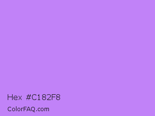 Hex #c182f8 Color is a light purple color and the nearest color is Pale Violet #cc99ff. Hex code #c182f8 and RGB value is rgb(193,130,248). In RGB color space, this color is composed of 76% red, 51% green, 97% blue, In CMYK color space, this color is composed of 22% cyan, 48% magenta, 0% yellow , 3% black , In HSL color space, this color has a hue angle of 272° , 89% saturation and 74% lightness.