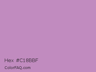 Hex #c18bbf Color is a light magenta color and the nearest color is African Violet #b284be. Hex code #c18bbf and RGB value is rgb(193,139,191). In RGB color space, this color is composed of 76% red, 55% green, 75% blue, In CMYK color space, this color is composed of 0% cyan, 28% magenta, 1% yellow , 24% black , In HSL color space, this color has a hue angle of 302° , 30% saturation and 65% lightness.