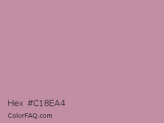 Hex #c18ea4 Color is a light rose color and the nearest color is Viola #cb8fa9. Hex code #c18ea4 and RGB value is rgb(193,142,164). In RGB color space, this color is composed of 76% red, 56% green, 64% blue, In CMYK color space, this color is composed of 0% cyan, 26% magenta, 15% yellow , 24% black , In HSL color space, this color has a hue angle of 334° , 29% saturation and 66% lightness.
