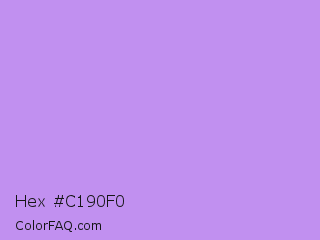 Hex #c190f0 Color is a light purple color and the nearest color is Bright Lavender #bf94e4. Hex code #c190f0 and RGB value is rgb(193,144,240). In RGB color space, this color is composed of 76% red, 56% green, 94% blue, In CMYK color space, this color is composed of 20% cyan, 40% magenta, 0% yellow , 6% black , In HSL color space, this color has a hue angle of 271° , 76% saturation and 75% lightness.