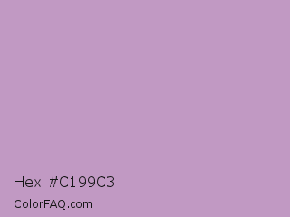 Hex #c199c3 Color is a light magenta color and the nearest color is Pastel Violet #cb99c9. Hex code #c199c3 and RGB value is rgb(193,153,195). In RGB color space, this color is composed of 76% red, 60% green, 76% blue, In CMYK color space, this color is composed of 1% cyan, 22% magenta, 0% yellow , 24% black , In HSL color space, this color has a hue angle of 297° , 26% saturation and 68% lightness.
