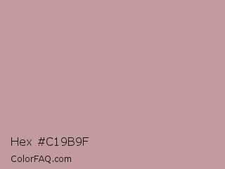 Hex #c19b9f Color is a light red color and the nearest color is Tuscany #c09999. Hex code #c19b9f and RGB value is rgb(193,155,159). In RGB color space, this color is composed of 76% red, 61% green, 62% blue, In CMYK color space, this color is composed of 0% cyan, 20% magenta, 18% yellow , 24% black , In HSL color space, this color has a hue angle of 354° , 23% saturation and 68% lightness.