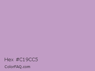 Hex #c19cc5 Color is a light magenta color and the nearest color is Lilac #c8a2c8. Hex code #c19cc5 and RGB value is rgb(193,156,197). In RGB color space, this color is composed of 76% red, 61% green, 77% blue, In CMYK color space, this color is composed of 2% cyan, 21% magenta, 0% yellow , 23% black , In HSL color space, this color has a hue angle of 294° , 26% saturation and 69% lightness.
