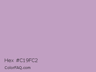 Hex #c19fc2 Color is a light magenta color and the nearest color is London Hue #bea6c3. Hex code #c19fc2 and RGB value is rgb(193,159,194). In RGB color space, this color is composed of 76% red, 62% green, 76% blue, In CMYK color space, this color is composed of 1% cyan, 18% magenta, 0% yellow , 24% black , In HSL color space, this color has a hue angle of 298° , 22% saturation and 69% lightness.