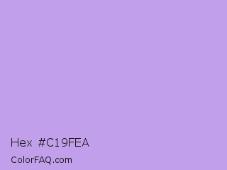 Hex #c19fea Color is a light violet color and the nearest color is Bright Lavender #bf94e4. Hex code #c19fea and RGB value is rgb(193,159,234). In RGB color space, this color is composed of 76% red, 62% green, 92% blue, In CMYK color space, this color is composed of 18% cyan, 32% magenta, 0% yellow , 8% black , In HSL color space, this color has a hue angle of 267° , 64% saturation and 77% lightness.