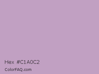 Hex #c1a0c2 Color is a light magenta color and the nearest color is London Hue #bea6c3. Hex code #c1a0c2 and RGB value is rgb(193,160,194). In RGB color space, this color is composed of 76% red, 63% green, 76% blue, In CMYK color space, this color is composed of 1% cyan, 18% magenta, 0% yellow , 24% black , In HSL color space, this color has a hue angle of 298° , 22% saturation and 69% lightness.