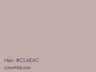 Hex #c1aeac Color is a light red color and the nearest color is Silver Pink #c4aead. Hex code #c1aeac and RGB value is rgb(193,174,172). In RGB color space, this color is composed of 76% red, 68% green, 67% blue, In CMYK color space, this color is composed of 0% cyan, 10% magenta, 11% yellow , 24% black , In HSL color space, this color has a hue angle of 6° , 14% saturation and 72% lightness.