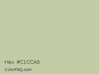 Hex #c1cca6 Color is a light lime color and the nearest color is Rainee #b9c8ac. Hex code #c1cca6 and RGB value is rgb(193,204,166). In RGB color space, this color is composed of 76% red, 80% green, 65% blue, In CMYK color space, this color is composed of 5% cyan, 0% magenta, 19% yellow , 20% black , In HSL color space, this color has a hue angle of 77° , 27% saturation and 73% lightness.
