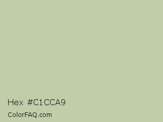 Hex #c1cca9 Color is a light lime color and the nearest color is Coriander #c4d0b0. Hex code #c1cca9 and RGB value is rgb(193,204,169). In RGB color space, this color is composed of 76% red, 80% green, 66% blue, In CMYK color space, this color is composed of 5% cyan, 0% magenta, 17% yellow , 20% black , In HSL color space, this color has a hue angle of 79° , 26% saturation and 73% lightness.