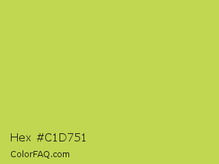 Hex #c1d751 Color is a normal yellow color and the nearest color is June Bud #bdda57. Hex code #c1d751 and RGB value is rgb(193,215,81). In RGB color space, this color is composed of 76% red, 84% green, 32% blue, In CMYK color space, this color is composed of 10% cyan, 0% magenta, 62% yellow , 16% black , In HSL color space, this color has a hue angle of 70° , 63% saturation and 58% lightness.