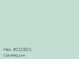 Hex #c1ded1 Color is a very light green color and the nearest color is Sea Mist #c5dbca. Hex code #c1ded1 and RGB value is rgb(193,222,209). In RGB color space, this color is composed of 76% red, 87% green, 82% blue, In CMYK color space, this color is composed of 13% cyan, 0% magenta, 6% yellow , 13% black , In HSL color space, this color has a hue angle of 153° , 31% saturation and 81% lightness.