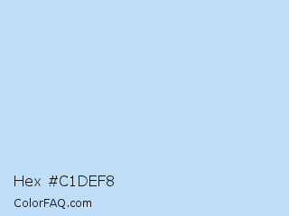 Hex #c1def8 Color is a very light blue color and the nearest color is Tropical Blue #c3ddf9. Hex code #c1def8 and RGB value is rgb(193,222,248). In RGB color space, this color is composed of 76% red, 87% green, 97% blue, In CMYK color space, this color is composed of 22% cyan, 10% magenta, 0% yellow , 3% black , In HSL color space, this color has a hue angle of 208° , 80% saturation and 86% lightness.