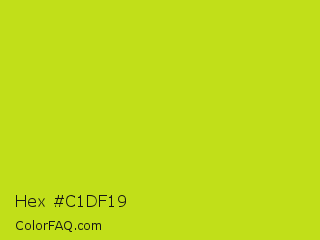 Hex #c1df19 Color is a normal yellow color and the nearest color is Fuego #bede0d. Hex code #c1df19 and RGB value is rgb(193,223,25). In RGB color space, this color is composed of 76% red, 87% green, 10% blue, In CMYK color space, this color is composed of 13% cyan, 0% magenta, 89% yellow , 13% black , In HSL color space, this color has a hue angle of 69° , 80% saturation and 49% lightness.