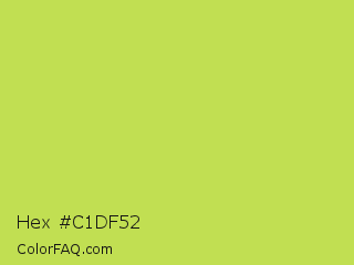 Hex #c1df52 Color is a normal lime color and the nearest color is June Bud #bdda57. Hex code #c1df52 and RGB value is rgb(193,223,82). In RGB color space, this color is composed of 76% red, 87% green, 32% blue, In CMYK color space, this color is composed of 13% cyan, 0% magenta, 63% yellow , 13% black , In HSL color space, this color has a hue angle of 73° , 69% saturation and 60% lightness.