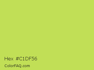 Hex #c1df56 Color is a light lime color and the nearest color is June Bud #bdda57. Hex code #c1df56 and RGB value is rgb(193,223,86). In RGB color space, this color is composed of 76% red, 87% green, 34% blue, In CMYK color space, this color is composed of 13% cyan, 0% magenta, 61% yellow , 13% black , In HSL color space, this color has a hue angle of 73° , 68% saturation and 61% lightness.