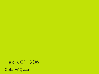 Hex #c1e206 Color is a normal yellow color and the nearest color is Fuego #bede0d. Hex code #c1e206 and RGB value is rgb(193,226,6). In RGB color space, this color is composed of 76% red, 89% green, 2% blue, In CMYK color space, this color is composed of 15% cyan, 0% magenta, 97% yellow , 11% black , In HSL color space, this color has a hue angle of 69° , 95% saturation and 45% lightness.