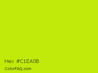 Hex #c1ea0b Color is a normal lime color and the nearest color is Las Palmas #c6e610. Hex code #c1ea0b and RGB value is rgb(193,234,11). In RGB color space, this color is composed of 76% red, 92% green, 4% blue, In CMYK color space, this color is composed of 18% cyan, 0% magenta, 95% yellow , 8% black , In HSL color space, this color has a hue angle of 71° , 91% saturation and 48% lightness.