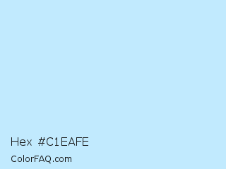 Hex #c1eafe Color is a very light blue color and the nearest color is French Pass #bdedfd. Hex code #c1eafe and RGB value is rgb(193,234,254). In RGB color space, this color is composed of 76% red, 92% green, 100% blue, In CMYK color space, this color is composed of 24% cyan, 8% magenta, 0% yellow , 0% black , In HSL color space, this color has a hue angle of 200° , 97% saturation and 88% lightness.