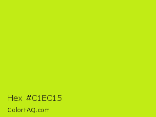 Hex #c1ec15 Color is a normal lime color and the nearest color is Las Palmas #c6e610. Hex code #c1ec15 and RGB value is rgb(193,236,21). In RGB color space, this color is composed of 76% red, 93% green, 8% blue, In CMYK color space, this color is composed of 18% cyan, 0% magenta, 91% yellow , 7% black , In HSL color space, this color has a hue angle of 72° , 85% saturation and 50% lightness.