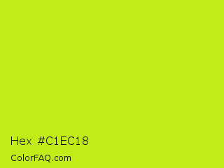 Hex #c1ec18 Color is a normal lime color and the nearest color is Las Palmas #c6e610. Hex code #c1ec18 and RGB value is rgb(193,236,24). In RGB color space, this color is composed of 76% red, 93% green, 9% blue, In CMYK color space, this color is composed of 18% cyan, 0% magenta, 90% yellow , 7% black , In HSL color space, this color has a hue angle of 72° , 85% saturation and 51% lightness.