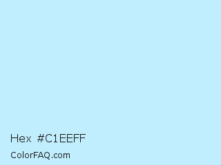 Hex #c1eeff Color is a very light blue color and the nearest color is French Pass #bdedfd. Hex code #c1eeff and RGB value is rgb(193,238,255). In RGB color space, this color is composed of 76% red, 93% green, 100% blue, In CMYK color space, this color is composed of 24% cyan, 7% magenta, 0% yellow , 0% black , In HSL color space, this color has a hue angle of 196° , 100% saturation and 88% lightness.