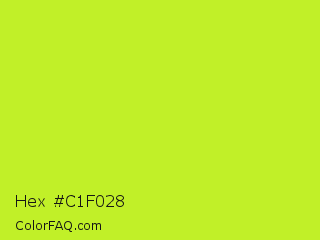 Hex #c1f028 Color is a normal lime color and the nearest color is Pear #d1e231. Hex code #c1f028 and RGB value is rgb(193,240,40). In RGB color space, this color is composed of 76% red, 94% green, 16% blue, In CMYK color space, this color is composed of 20% cyan, 0% magenta, 83% yellow , 6% black , In HSL color space, this color has a hue angle of 74° , 87% saturation and 55% lightness.