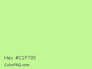Hex #c1f795 Color is a light green color and the nearest color is Reef #c9ffa2. Hex code #c1f795 and RGB value is rgb(193,247,149). In RGB color space, this color is composed of 76% red, 97% green, 58% blue, In CMYK color space, this color is composed of 22% cyan, 0% magenta, 40% yellow , 3% black , In HSL color space, this color has a hue angle of 93° , 86% saturation and 78% lightness.