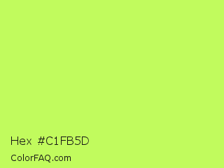 Hex #c1fb5d Color is a light green color and the nearest color is Inchworm #b2ec5d. Hex code #c1fb5d and RGB value is rgb(193,251,93). In RGB color space, this color is composed of 76% red, 98% green, 36% blue, In CMYK color space, this color is composed of 23% cyan, 0% magenta, 63% yellow , 2% black , In HSL color space, this color has a hue angle of 82° , 95% saturation and 67% lightness.