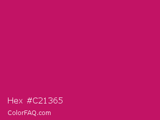 Hex #c21365 Color is a normal rose color and the nearest color is Rose Red #c21e56. Hex code #c21365 and RGB value is rgb(194,19,101). In RGB color space, this color is composed of 76% red, 7% green, 40% blue, In CMYK color space, this color is composed of 0% cyan, 90% magenta, 48% yellow , 24% black , In HSL color space, this color has a hue angle of 332° , 82% saturation and 42% lightness.