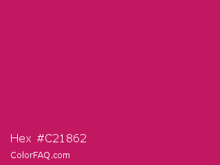 Hex #c21862 Color is a normal rose color and the nearest color is Rose Red #c21e56. Hex code #c21862 and RGB value is rgb(194,24,98). In RGB color space, this color is composed of 76% red, 9% green, 38% blue, In CMYK color space, this color is composed of 0% cyan, 88% magenta, 49% yellow , 24% black , In HSL color space, this color has a hue angle of 334° , 78% saturation and 43% lightness.