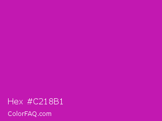 Hex #c218b1 Color is a normal magenta color and the nearest color is Byzantine #bd33a4. Hex code #c218b1 and RGB value is rgb(194,24,177). In RGB color space, this color is composed of 76% red, 9% green, 69% blue, In CMYK color space, this color is composed of 0% cyan, 88% magenta, 9% yellow , 24% black , In HSL color space, this color has a hue angle of 306° , 78% saturation and 43% lightness.