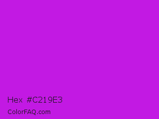 Hex #c219e3 Color is a normal purple color and the nearest color is Vivid Mulberry #b80ce3. Hex code #c219e3 and RGB value is rgb(194,25,227). In RGB color space, this color is composed of 76% red, 10% green, 89% blue, In CMYK color space, this color is composed of 15% cyan, 89% magenta, 0% yellow , 11% black , In HSL color space, this color has a hue angle of 290° , 80% saturation and 49% lightness.
