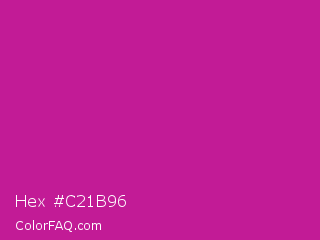Hex #c21b96 Color is a normal magenta color and the nearest color is Red Violet #c71585. Hex code #c21b96 and RGB value is rgb(194,27,150). In RGB color space, this color is composed of 76% red, 11% green, 59% blue, In CMYK color space, this color is composed of 0% cyan, 86% magenta, 23% yellow , 24% black , In HSL color space, this color has a hue angle of 316° , 76% saturation and 43% lightness.