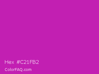 Hex #c21fb2 Color is a normal magenta color and the nearest color is Byzantine #bd33a4. Hex code #c21fb2 and RGB value is rgb(194,31,178). In RGB color space, this color is composed of 76% red, 12% green, 70% blue, In CMYK color space, this color is composed of 0% cyan, 84% magenta, 8% yellow , 24% black , In HSL color space, this color has a hue angle of 306° , 72% saturation and 44% lightness.