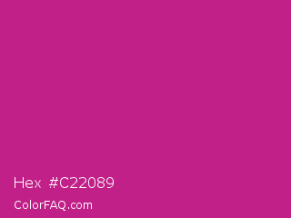Hex #c22089 Color is a normal magenta color and the nearest color is Red Violet #c71585. Hex code #c22089 and RGB value is rgb(194,32,137). In RGB color space, this color is composed of 76% red, 13% green, 54% blue, In CMYK color space, this color is composed of 0% cyan, 84% magenta, 29% yellow , 24% black , In HSL color space, this color has a hue angle of 321° , 72% saturation and 44% lightness.