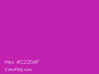 Hex #c220af Color is a normal magenta color and the nearest color is Byzantine #bd33a4. Hex code #c220af and RGB value is rgb(194,32,175). In RGB color space, this color is composed of 76% red, 13% green, 69% blue, In CMYK color space, this color is composed of 0% cyan, 84% magenta, 10% yellow , 24% black , In HSL color space, this color has a hue angle of 307° , 72% saturation and 44% lightness.