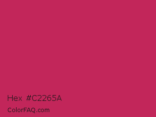 Hex #c2265a Color is a normal rose color and the nearest color is Rose Red #c21e56. Hex code #c2265a and RGB value is rgb(194,38,90). In RGB color space, this color is composed of 76% red, 15% green, 35% blue, In CMYK color space, this color is composed of 0% cyan, 80% magenta, 54% yellow , 24% black , In HSL color space, this color has a hue angle of 340° , 67% saturation and 45% lightness.