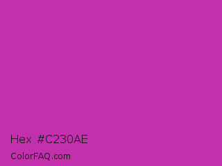 Hex #c230ae Color is a normal magenta color and the nearest color is Byzantine #bd33a4. Hex code #c230ae and RGB value is rgb(194,48,174). In RGB color space, this color is composed of 76% red, 19% green, 68% blue, In CMYK color space, this color is composed of 0% cyan, 75% magenta, 10% yellow , 24% black , In HSL color space, this color has a hue angle of 308° , 60% saturation and 47% lightness.