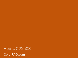 Hex #c25508 Color is a normal orange color and the nearest color is Rose Of Sharon #bf5500. Hex code #c25508 and RGB value is rgb(194,85,8). In RGB color space, this color is composed of 76% red, 33% green, 3% blue, In CMYK color space, this color is composed of 0% cyan, 56% magenta, 96% yellow , 24% black , In HSL color space, this color has a hue angle of 25° , 92% saturation and 40% lightness.