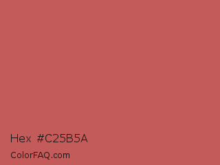 Hex #c25b5a Color is a normal red color and the nearest color is Fuzzy Wuzzy Brown #c45655. Hex code #c25b5a and RGB value is rgb(194,91,90). In RGB color space, this color is composed of 76% red, 36% green, 35% blue, In CMYK color space, this color is composed of 0% cyan, 53% magenta, 54% yellow , 24% black , In HSL color space, this color has a hue angle of 1° , 46% saturation and 56% lightness.