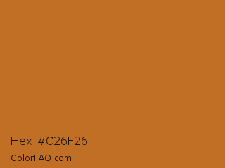 Hex #c26f26 Color is a normal orange color and the nearest color is Liver Dogs #b86d29. Hex code #c26f26 and RGB value is rgb(194,111,38). In RGB color space, this color is composed of 76% red, 44% green, 15% blue, In CMYK color space, this color is composed of 0% cyan, 43% magenta, 80% yellow , 24% black , In HSL color space, this color has a hue angle of 28° , 67% saturation and 45% lightness.
