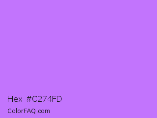 Hex #c274fd Color is a light purple color and the nearest color is Heliotrope #df73ff. Hex code #c274fd and RGB value is rgb(194,116,253). In RGB color space, this color is composed of 76% red, 45% green, 99% blue, In CMYK color space, this color is composed of 23% cyan, 54% magenta, 0% yellow , 1% black , In HSL color space, this color has a hue angle of 274° , 97% saturation and 72% lightness.