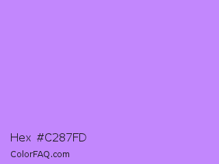 Hex #c287fd Color is a light violet color and the nearest color is Pale Violet #cc99ff. Hex code #c287fd and RGB value is rgb(194,135,253). In RGB color space, this color is composed of 76% red, 53% green, 99% blue, In CMYK color space, this color is composed of 23% cyan, 47% magenta, 0% yellow , 1% black , In HSL color space, this color has a hue angle of 270° , 97% saturation and 76% lightness.