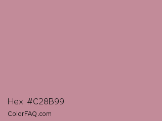 Hex #c28b99 Color is a light red color and the nearest color is Puce #cc8899. Hex code #c28b99 and RGB value is rgb(194,139,153). In RGB color space, this color is composed of 76% red, 55% green, 60% blue, In CMYK color space, this color is composed of 0% cyan, 28% magenta, 21% yellow , 24% black , In HSL color space, this color has a hue angle of 345° , 31% saturation and 65% lightness.