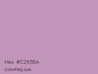 Hex #c295ba Color is a light magenta color and the nearest color is Pastel Violet #cb99c9. Hex code #c295ba and RGB value is rgb(194,149,186). In RGB color space, this color is composed of 76% red, 58% green, 73% blue, In CMYK color space, this color is composed of 0% cyan, 23% magenta, 4% yellow , 24% black , In HSL color space, this color has a hue angle of 311° , 27% saturation and 67% lightness.
