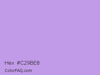 Hex #c29be8 Color is a light violet color and the nearest color is Bright Lavender #bf94e4. Hex code #c29be8 and RGB value is rgb(194,155,232). In RGB color space, this color is composed of 76% red, 61% green, 91% blue, In CMYK color space, this color is composed of 16% cyan, 33% magenta, 0% yellow , 9% black , In HSL color space, this color has a hue angle of 270° , 63% saturation and 76% lightness.