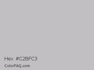 Hex #c2bfc3 Color is a light purple color and the nearest color is Pale Slate #c3bfc1. Hex code #c2bfc3 and RGB value is rgb(194,191,195). In RGB color space, this color is composed of 76% red, 75% green, 76% blue, In CMYK color space, this color is composed of 1% cyan, 2% magenta, 0% yellow , 24% black , In HSL color space, this color has a hue angle of 285° , 3% saturation and 76% lightness.